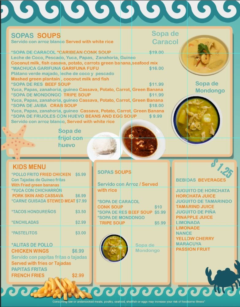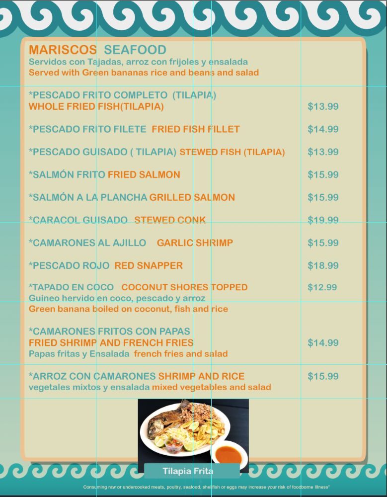 Leche de coco, pescado, yuca, papas, guíneo. El consumo de carnes, aves, mariscos o huevos crudos o poco cocidos puede aumentar el riesgo de contraer enfermedades transmitidas por los alimentos. / Coconut milk, fish, cassava, potato, green banana. Consuming raw or undercooked meats, poultry, seafood, shellfish or eggs may increase your risk of foodborne illness.